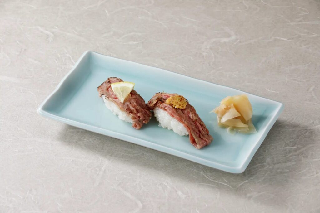 さっと炙った飛騨牛をネタにした握り寿司を2貫セットで提供。上質な赤身と脂が織りなす美味を心ゆくまで楽しめます。