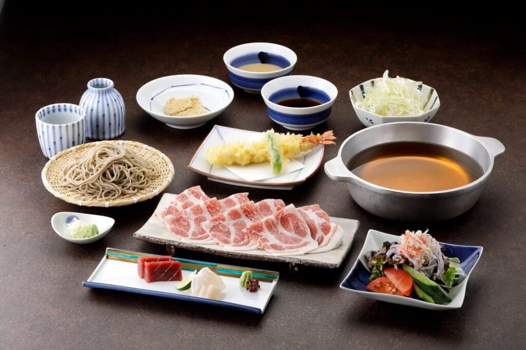 ズワイガニのサラダ・本日の刺身・大海老天ぷら・金華豚しゃぶしゃぶ・十割蕎麦・自家製わらび餅と、豪華な料理が一度に楽しめるスペシャルコース。十割蕎麦は、追加料金でほかのお蕎麦に