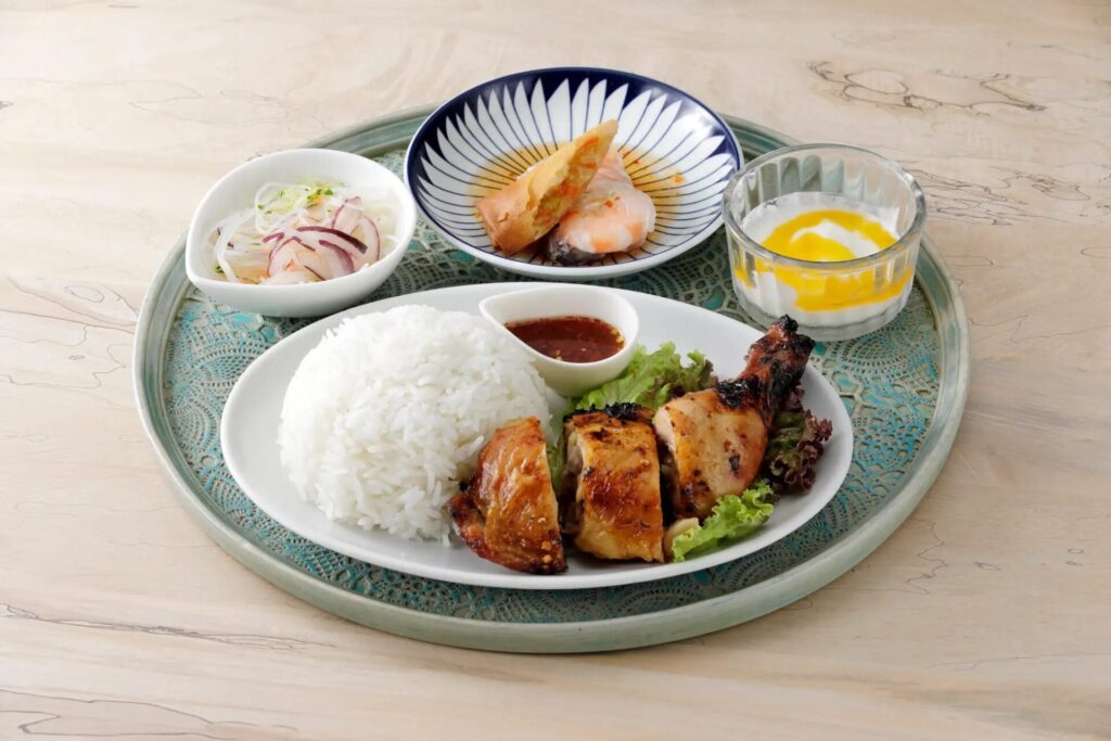 オリジナルのピリ辛ソースに漬け込んだタイ風照り焼きチキンをメインに据えた迫力満点のセット。一晩じっくり漬け込んだ骨付き肉をじっくりとオーブンで焼き上げることで、皮まで美味しく仕上がっています。