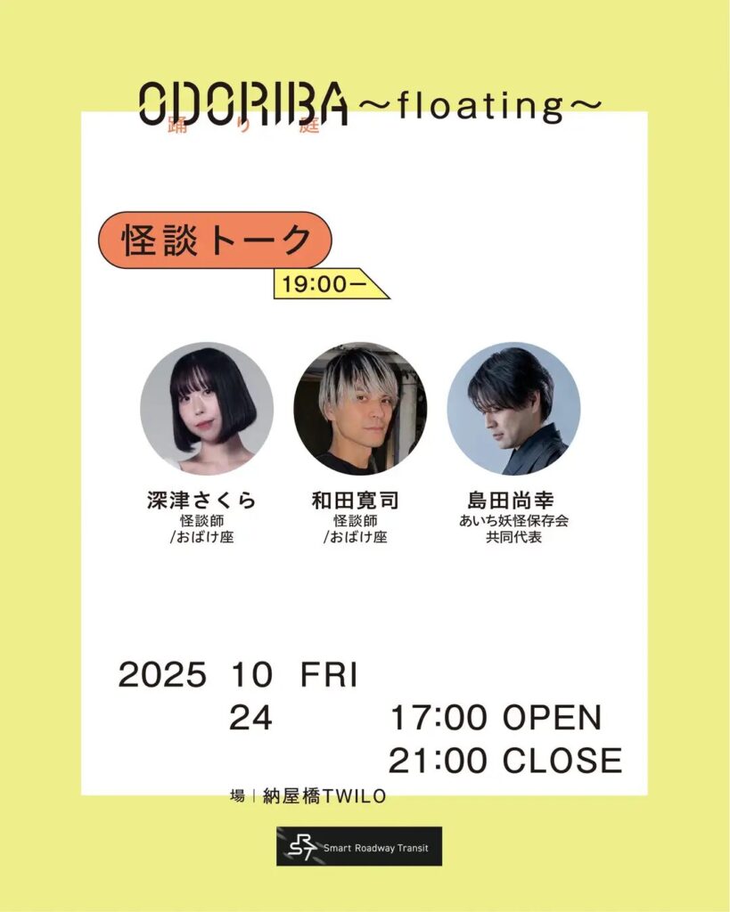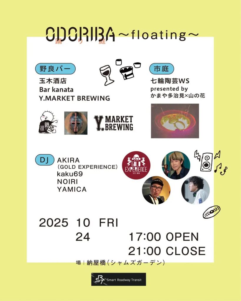 10月24日には、納屋橋エリアでも2つの会場で「ODORIBA ~floating~」が開催。シャムズガーデンではDJのパフォーマンスとともに野良バー・市庭を楽しめる実にマーケットが、納屋橋TWILOではカブトビールとともに楽しめる怪談トークが開かれます。