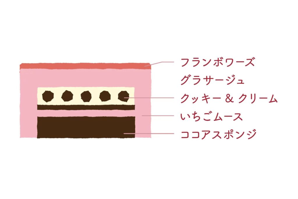 ふんわりとしたいちごムースの中に、しっとり食感のココアスポンジとクッキー&クリームを忍ばせ、フランボワーズのグラサージュを仕上げにトッピング。甘さの中にほんのり酸味のアクセントが入り、奥行きがプラスされています。