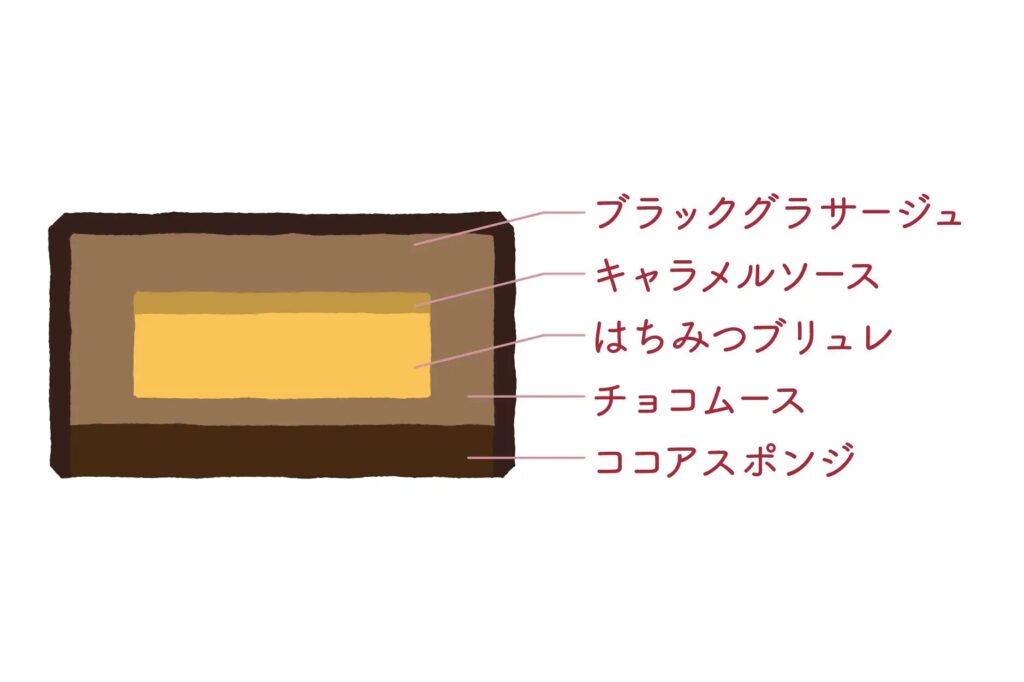 優しい甘さのチョコムースの中に、香ばしいキャラメルソースとはちみつブリュレを忍ばせ、仕上げにブラックグラサージュで艶やかなビジュアルに。ほんのりビターなチョコの味わいと、はちみつやキャラメルの甘みが絶妙にマッチしたおいしさとなっています。