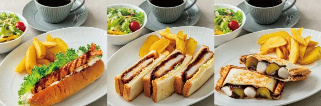 11時30分から14時までのランチタイムは、名古屋の味覚を存分に楽しめるご当地サンドがズラリとラインナップ。いずれもポテトフライとサラダ、ドリンクがセットになったお得なメニューとなっており、旅の合間にピッタリな、名古屋ならではの美味しさがあふれています。