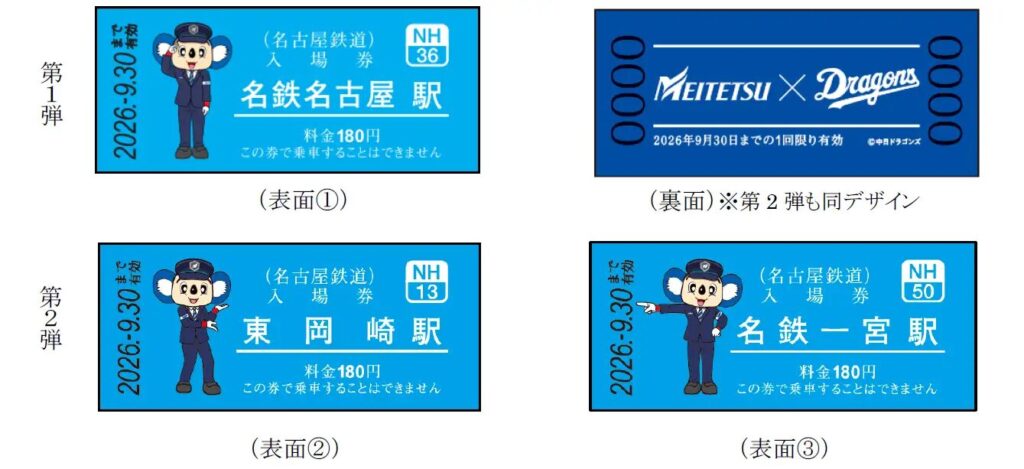 「中日ドラゴンズ コラボ硬券入場券」は第1弾として名鉄名古屋駅、金山駅、山王駅および瀬戸線各駅の計23駅分を2025年10月11日から2026年9月30日まで発売。その他の駅については第2弾として11月1日から2026年9月30日まで発売されます。