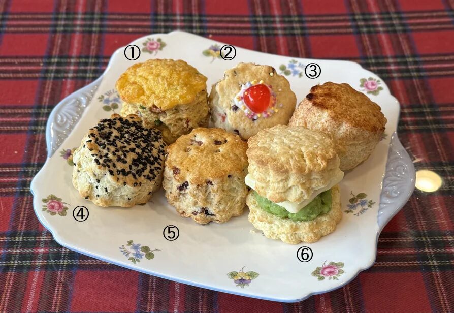 ①田子産にんにく入りカレーチーズスコーン(青森)②さくらんぼのスコーン(山形)③酒粕&味噌チーズスコーン(秋田)④南部小麦の黒ごまスコーン(岩手)⑤桃のクリスマススコーン(福島) ⑥ずんだ餡サンドスコーン(宮城)