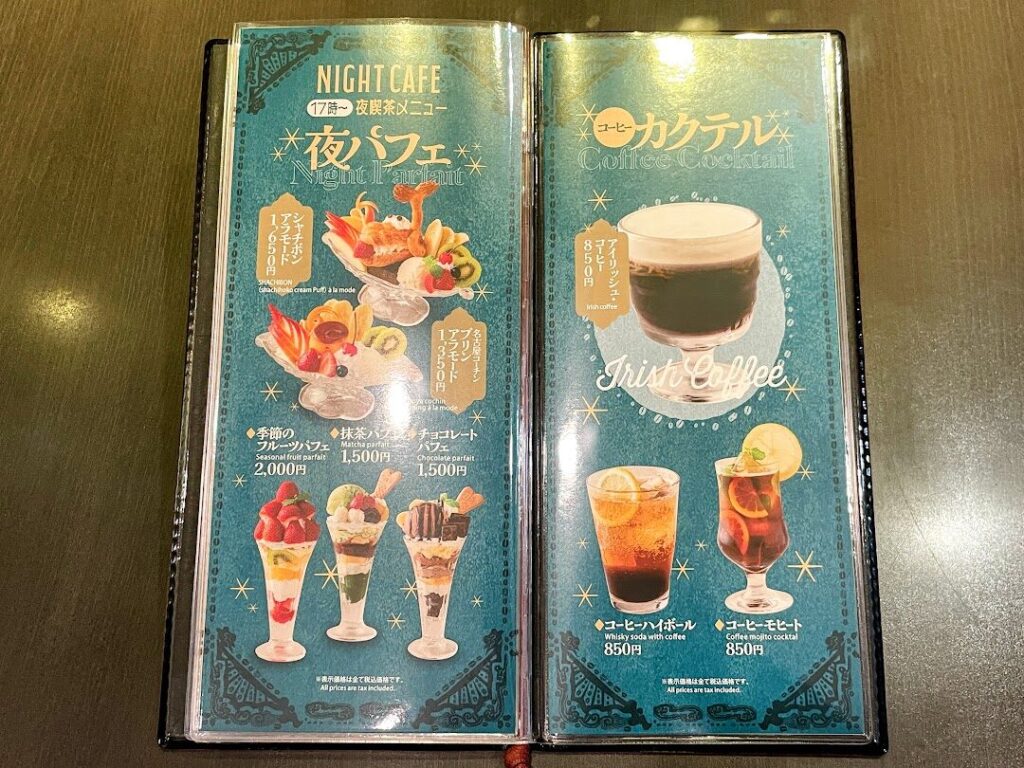 さらに夕方17時から夜喫茶メニューも登場。夜パフェやコーヒーカクテルなど、名古屋駅での夜を素敵に過ごせるメニューが楽しめます。