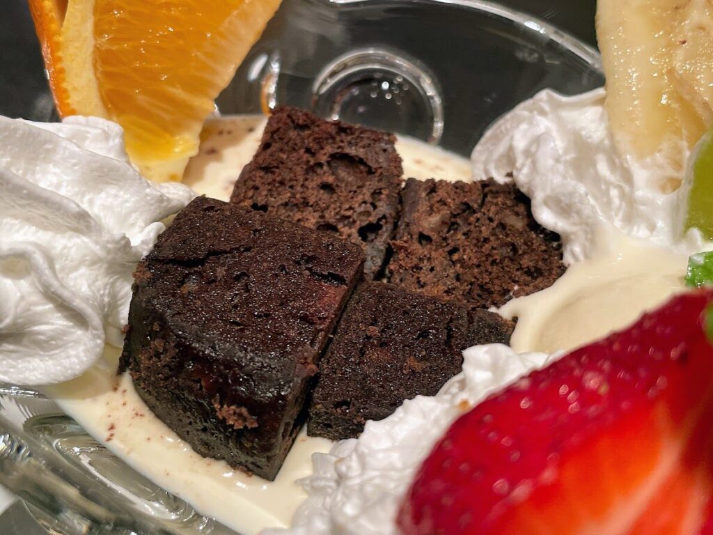 シャチボンの下にチョコブラウニーの座布団が敷かれているのも注目ポイント。ほろ苦い味わいが後口をさっぱりとさせてくれます。