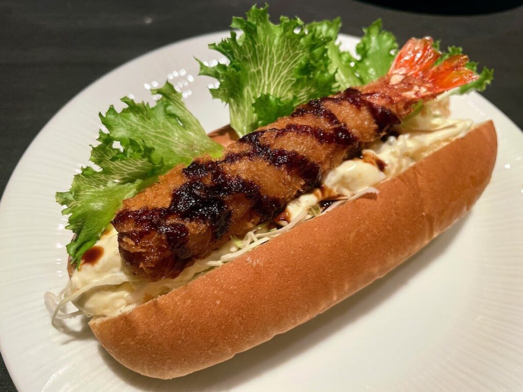海老フライドッグを一口かじってみたら、パンのふわっふわ食感にビックリ!このふわふわ食感のパンとミチッとしっかり筋肉質な海老との食感の対比がとっても素敵です。海老フライにかかったソースとタルタルソースのWソースも最高のおいしさ。シャキシャキの野菜がおいしさをいっそう引き立てていました。