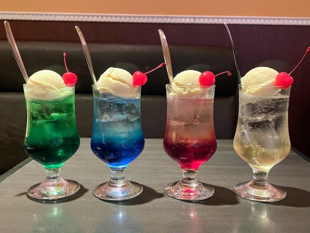 ドリンクメニューでの注目メニューはレトロ喫茶らしさ満点の「クリームソーダ」。喫茶ボン・ヴォヤージュでは緑のレモン、青のブルーキュラソー、赤のいちご、黄色のレモンの4色が提供されます。