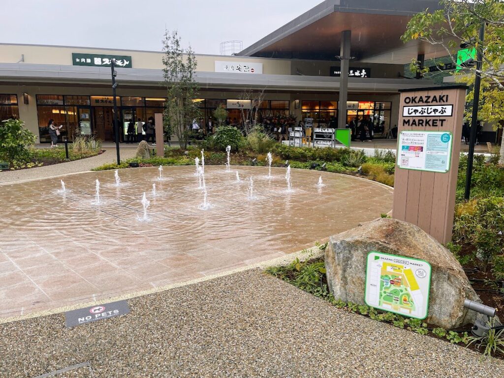 正面入口から入ってすぐの場所にあるのが「OKAZAKI じゃぶじゃぶ MARKET」。噴水が設置されているOKAZAKI MARKETのシンボル的な場所は、子どもたちが入って遊べる水遊び場としても整備されています。