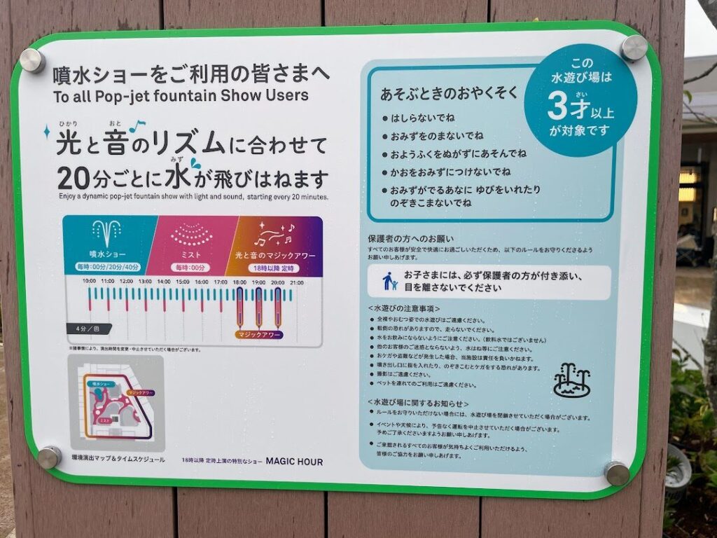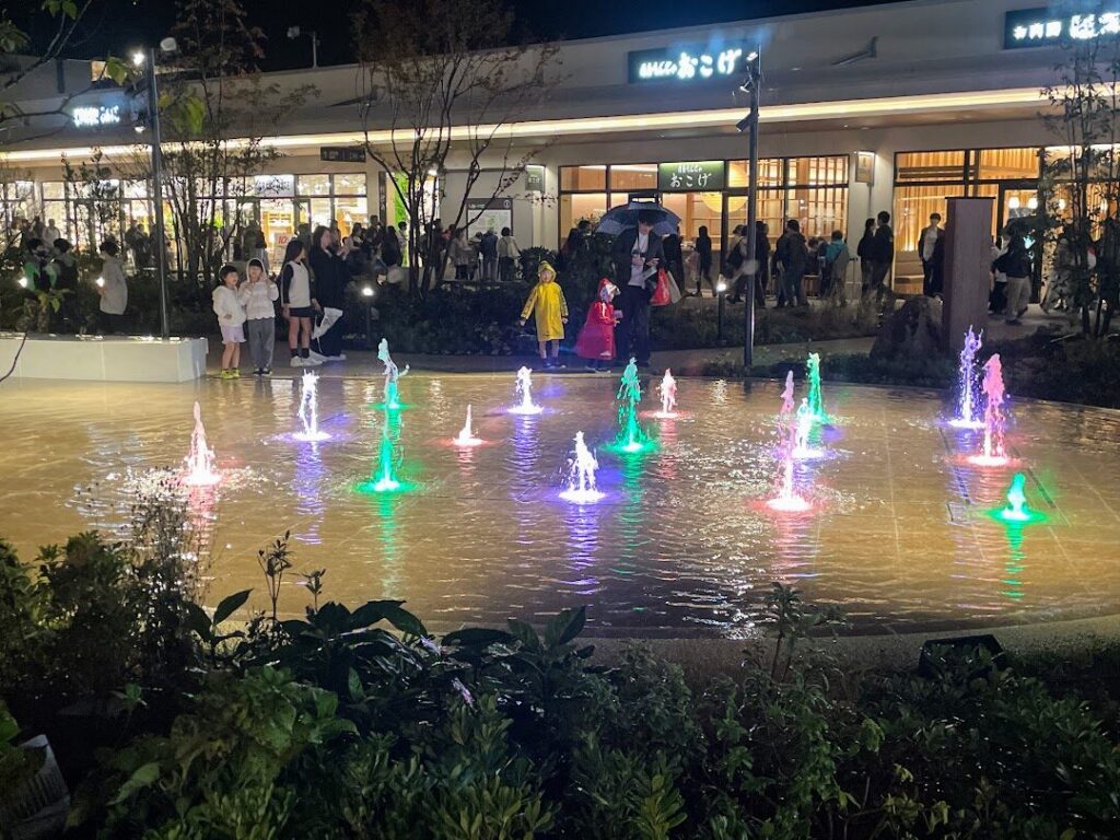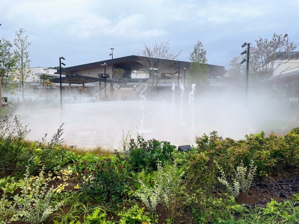 また、設置されている噴水は20分ごとに噴水ショーを実施。光と音のリズムに合わせて20分ごとに水が飛び跳ねる演出を楽しめます。毎時00分に行われるミストの演出も幻想的です。