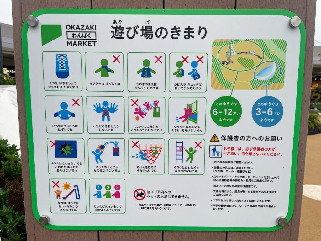 「OKAZAKI じゃぶじゃぶ MARKET」は3歳以上を対象としており、保護者の付き添いが前提。全裸やおむつ姿での水遊びはNGと注意事項に記載されています。なお、ペットは入ることができません。