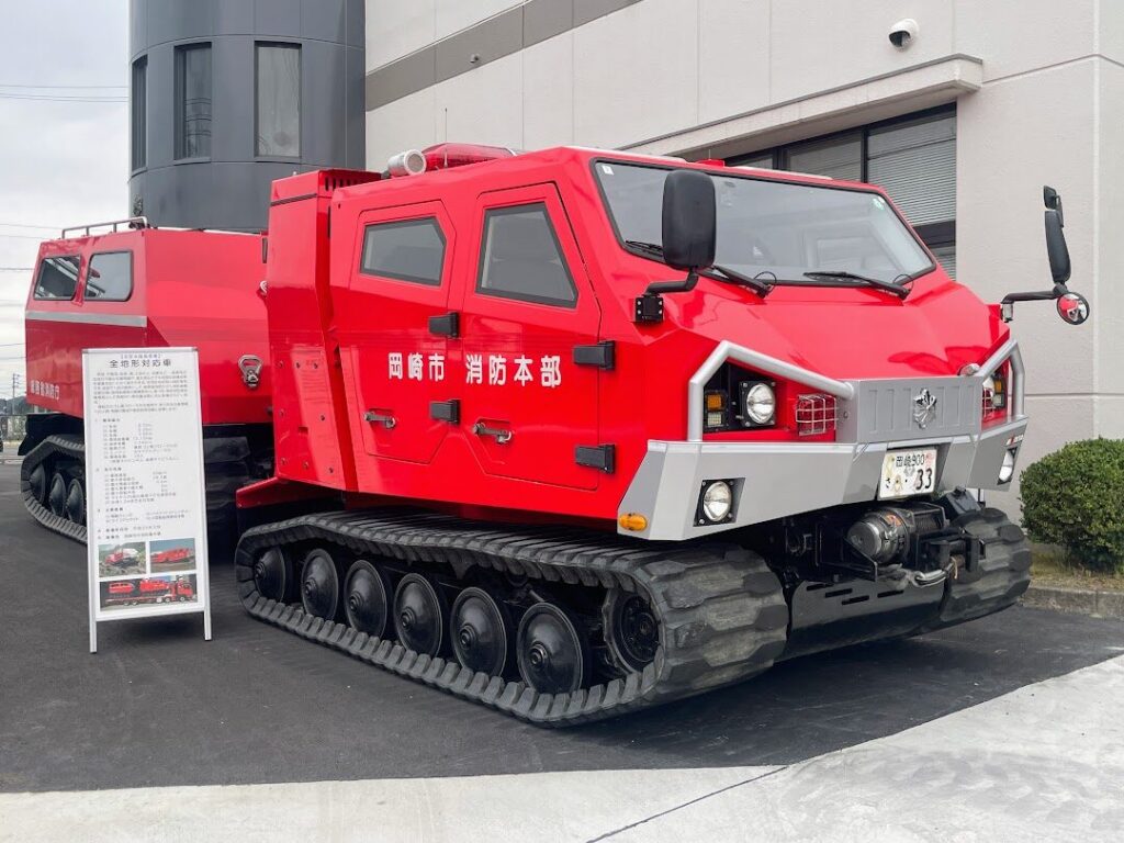 「三井アウトレットパーク岡崎」のすぐお隣には岡崎消防本部 東消防署本宿出張所がありますが、メディア内覧会の取材当日は、なんとここに全国にわずか2台しか配備されていない全地形対応車「レッドサラマンダー」が展示されていました。