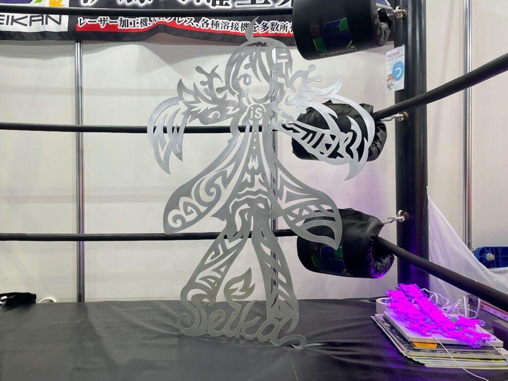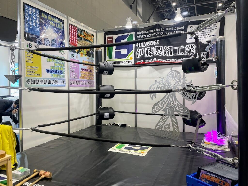 津島商工会議所ブース内の一角にてプロレスリングを展示していたのは有限会社伊藤製罐工業。長年培ったレーザー加工や溶接技術を駆使し、変圧器の部品をはじめとした各種鉄製品を製造する津島の鉄工所です。