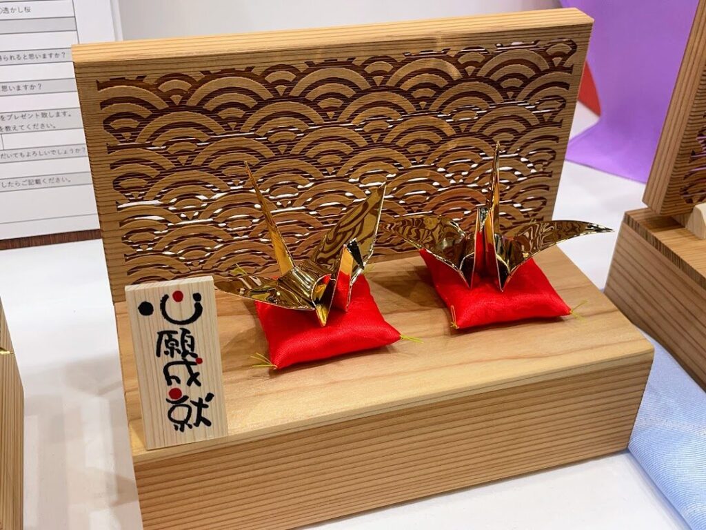 「幸せを呼ぶ金の折り鶴」は、薄い銅板を折り曲げて折り鶴にしたのち金メッキを施したもの。銅板を折り鶴に加工する作業は名古屋で暮らす障害者が担っていますが、会社の方が「自分たちが折るよりもはるかにきれいな折り鶴を作ってくれる」と言うほど高い技術で作られているそうです。