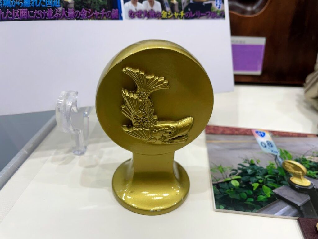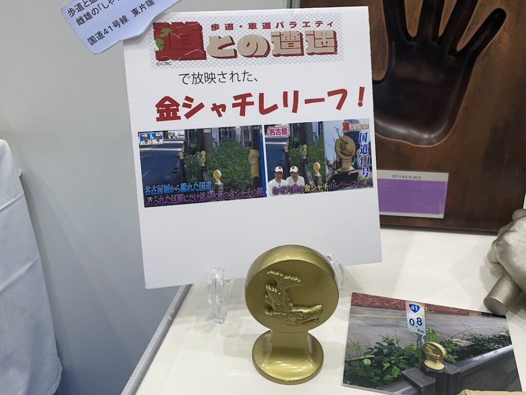 この金シャチレリーフを展示していたのは、名古屋で硬質ウレタン樹脂を用いた成型加工品の製作を行っているヘルメス株式会社。国道41号線沿いに設置されている同社が依頼を受けて製作したそうです。