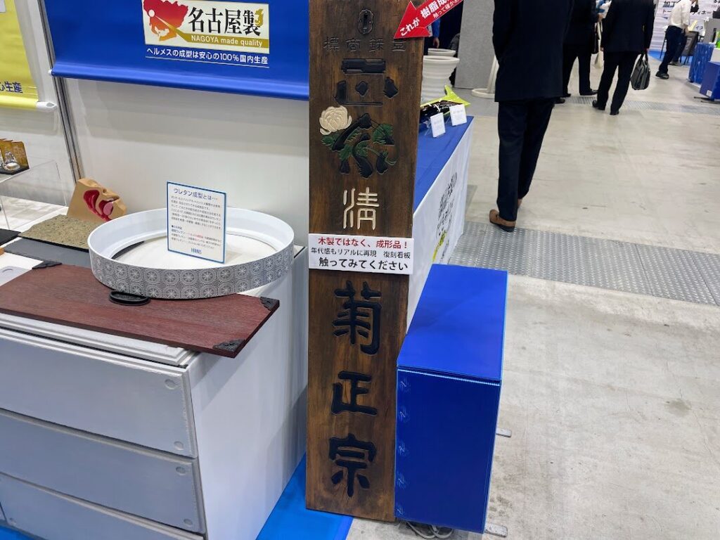 また、硬質ウレタンと同社の技術が組み合わせにより、様々なものの緻密にデザインを再現することができるとのこと。例えば古い木造の看板なども、同社の手にかかれば木目の一本一本まできれいに再現することができます。間近で見ても樹脂で出来ているとは思えないほどの質感です。