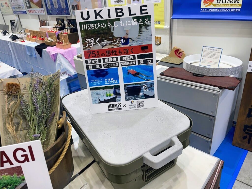 さらに最近は、硬質ウレタン樹脂の硬さと軽さを生かした自社商品も開発。コンテナボックスにはめて使えるテーブル天板「UKIBLE」は、大人の男性でもこれをつかめば水にしっかり浮くことができる「浮くテーブル」。水辺でのキャンプの際にこれを持って行けば、いざという時も安心です。