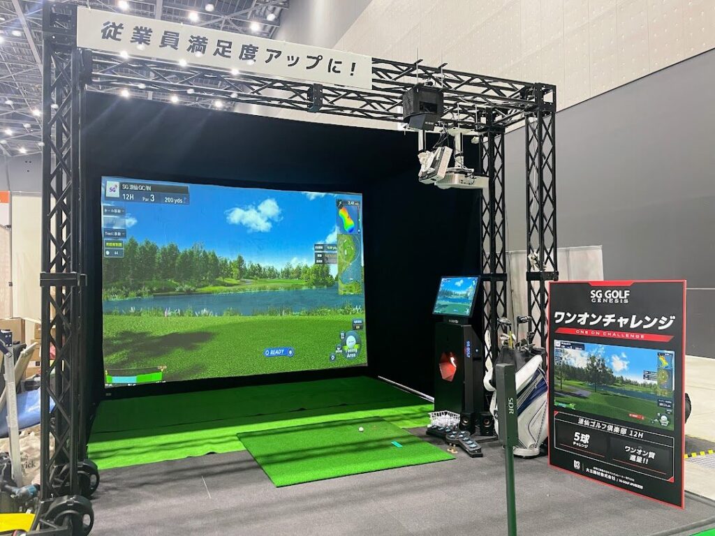 プロレスリングもあればゴルフシミュレーターも登場するのが「メッセナゴヤ」の面白さ。大三機材株式会社のブースでは福利厚生向け設備として最新のゴルフシミュレーターが紹介されており、「ワンオンチャレンジ」として無料体験することもできます。
