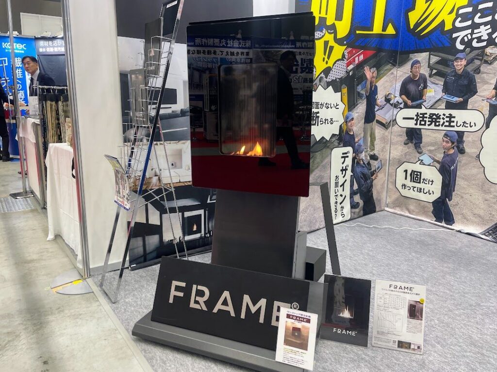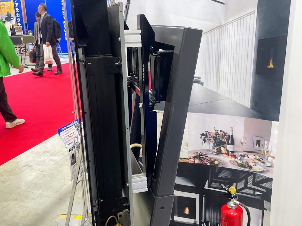 続いて注目したのが「壁に掛けられるガス暖炉」。板金加工や溶接を得意とする有限会社生川製作所のブースにて紹介されていました。