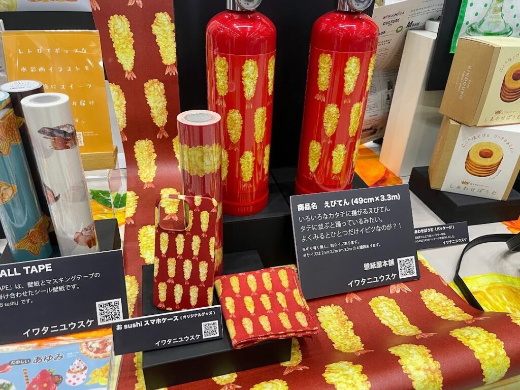 おいしそうなデザイン思わず足を止めたのは、えびてんのデザインが施された名古屋らしさ満点の消火器。鳴海商工会共同出展ブースにてイラストレーターとして活躍されているイワタニユウスケさんが手がけられたえび天アイテムがズラリと並んでいました。