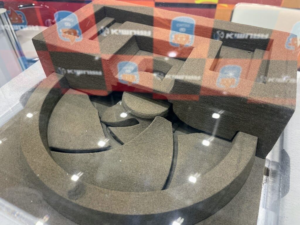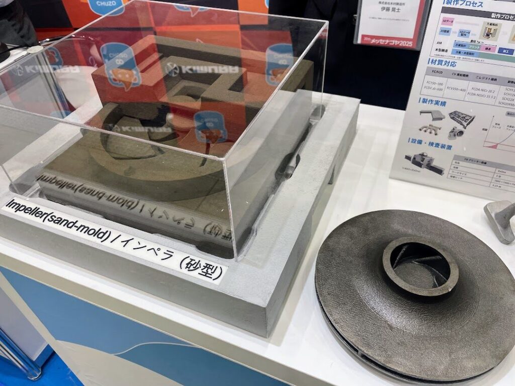株式会社木村鋳造所が紹介していたのが、鋳造の未来を変える3Dプリンター技術。これまでの鋳造では一度木材などで型を作ってから砂型を起こしていましたが、最新技術ではCADデータから直接砂型を起こせるようになっているそうです。