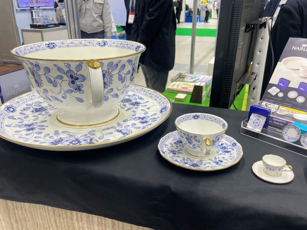 続いて発見したびっくりアイテムが超巨大なティーカップ! ノリタケと並ぶ洋食器ブランド「NARUMI」を手がける鳴海製陶株式会社のブースでは、超巨大サイズ・通常サイズ・超ミニサイズの”ティーカップ3兄弟”が並んでいました。