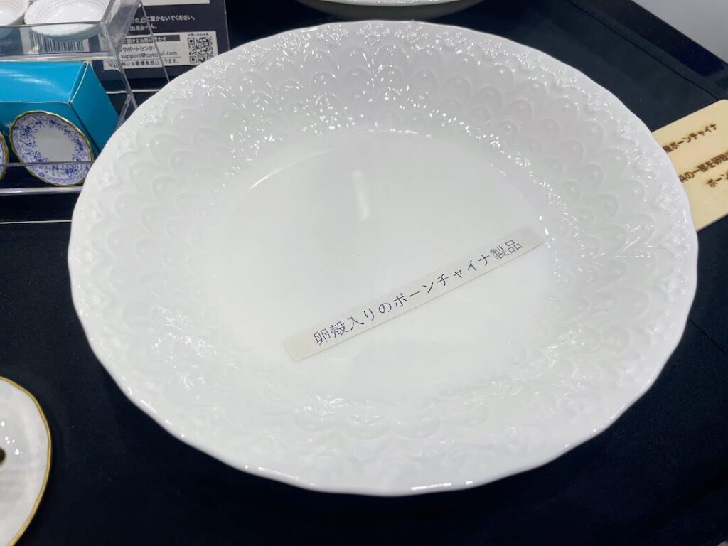 この技術を紹介するために卵も展示されていたのですが、実はこれもボーンチャイナで作った卵なんだそうです。卵殻でできたボーンチャイナと、ボーンチャイナで出来た卵殻、なんともおもしろい取り合わせです。