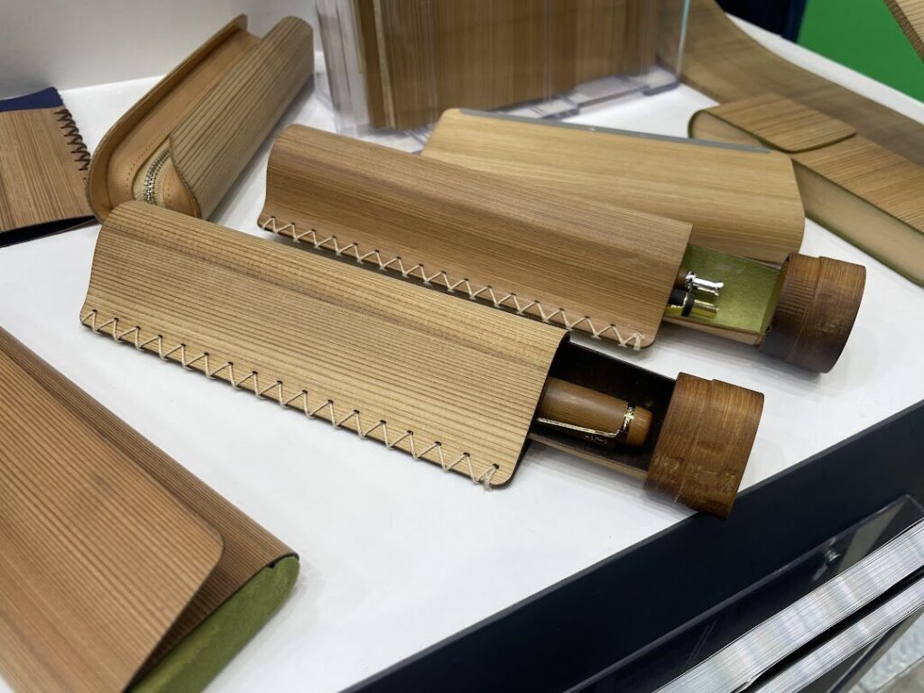 名古屋木材株式会社が紹介していたのが、”曲がる木材”「LIGNOFLEX」を使った様々なアイテム。独自の技術で柔軟性を付加しながら圧縮した木材は、割れることなく曲げられるため、ブックカバーやケースになどにピッタリ。木材ならではの温かみが手に馴染む、自然派の型ならつい手に取りたくなる素敵なアイテムがいっぱい並んでいました。