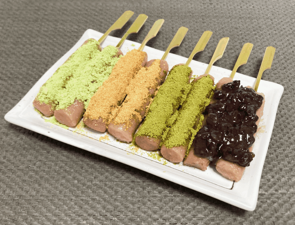 国産のたかきびを使用している1本1本手作りのピンク色の団子にきなこや、あんこなどをたっぷりとトッピングした、絶品のきびだんごを楽しめます。