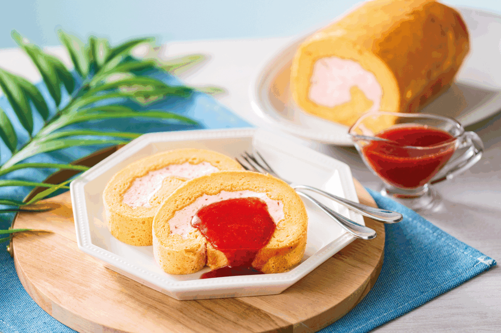 自家製いちごシロップをクリームに使い、つぶつぶ果肉が嬉しい優しい甘さがたまらない「つぶつぶ糸島いちごロールケーキ フルーツソースがけ」に注目です。