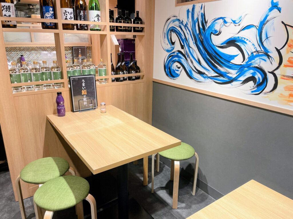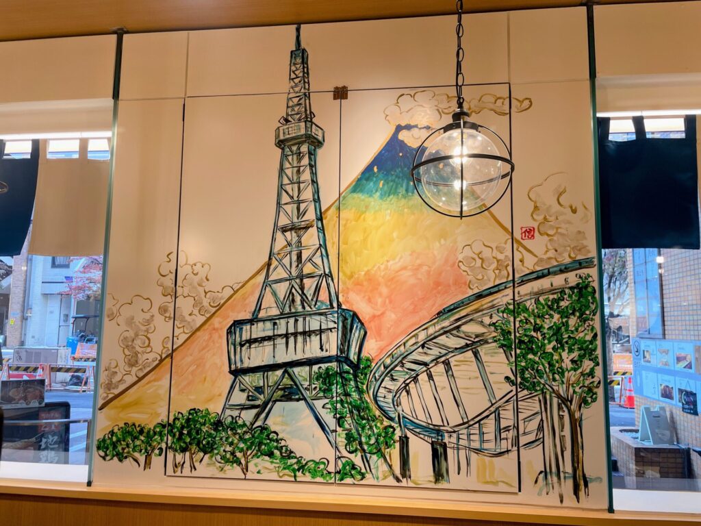 店内の壁面には、素敵なイラストがいっぱい! これらは全て「手描き」で書かれたもの。「鮨 酒 肴 杉玉」ではどのお店にもご当地感のあるイラストが描かれるのがお約束とのことで、今回のお店にも名古屋・栄のシンボルである中部電力MIRAI TOWERとオアシス21が大きく描かれていました。