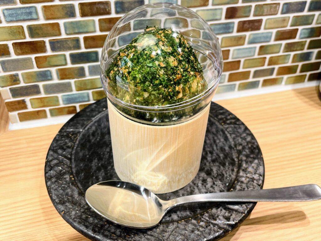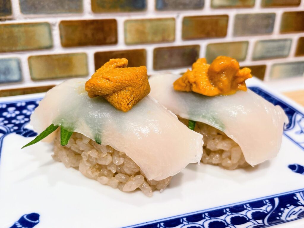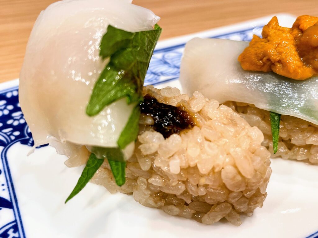 口に入れるとそこに広がるのは海そのもの。塩雲丹ならではの濃厚なおいしさと香り、とろけるように柔らかなイカからあふれだす旨味が口いっぱいに広がります。おいしさをさらに高めているのが、隠し味として忍ばせている「のりわさび」。溢れ出す海の味わいを、大葉の爽やかさがしっかりと締め、最高の贅沢気分が味わえました。