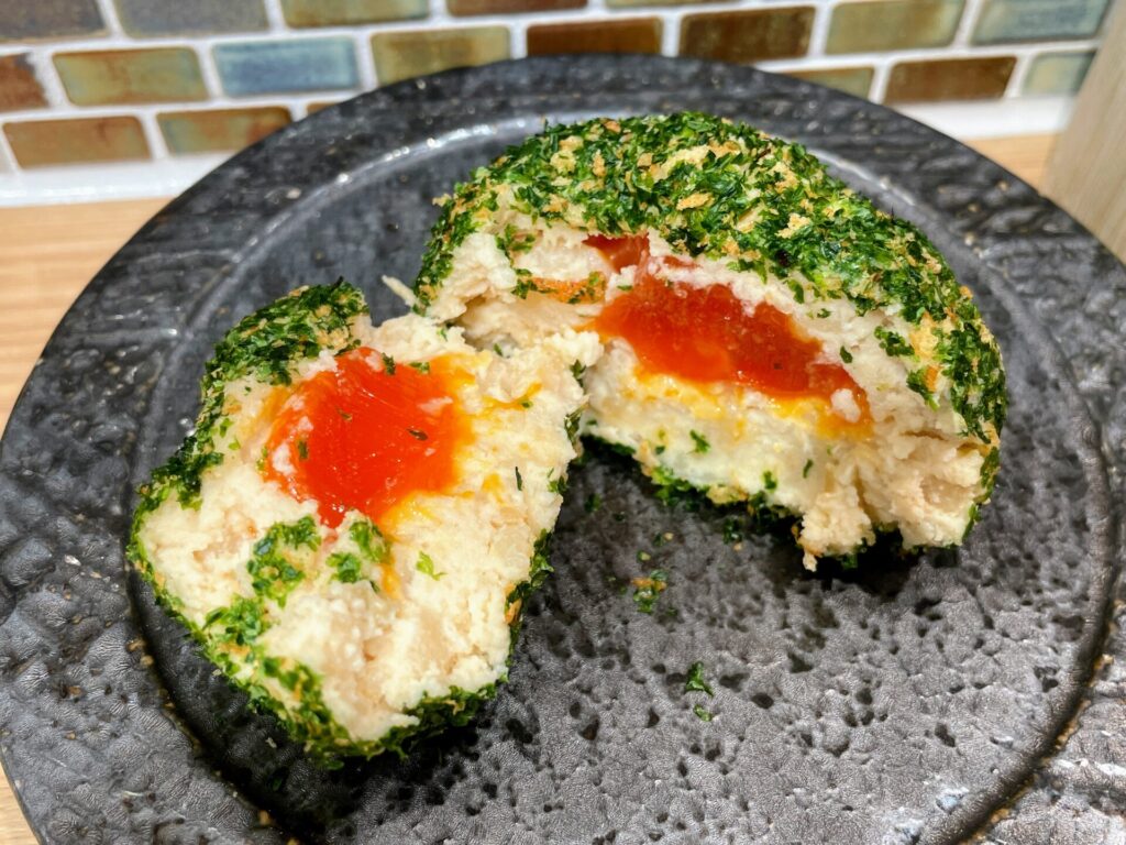 カプセルに入ってくるポテトサラダをコロンとお皿の上に転がしていただくのが「杉玉ポテトサラダ」の食べ方。半分に割ってみると、中からは美しい橙色をした卵黄が現れました。ちなみに、表面を彩っているのはアオサや干しエビ、パン粉などを炒って作ったという特製の”杉粉”。見た目の美しさだけでなく、アオサや干しエビの風味が味わいの面白さも演出しています。
