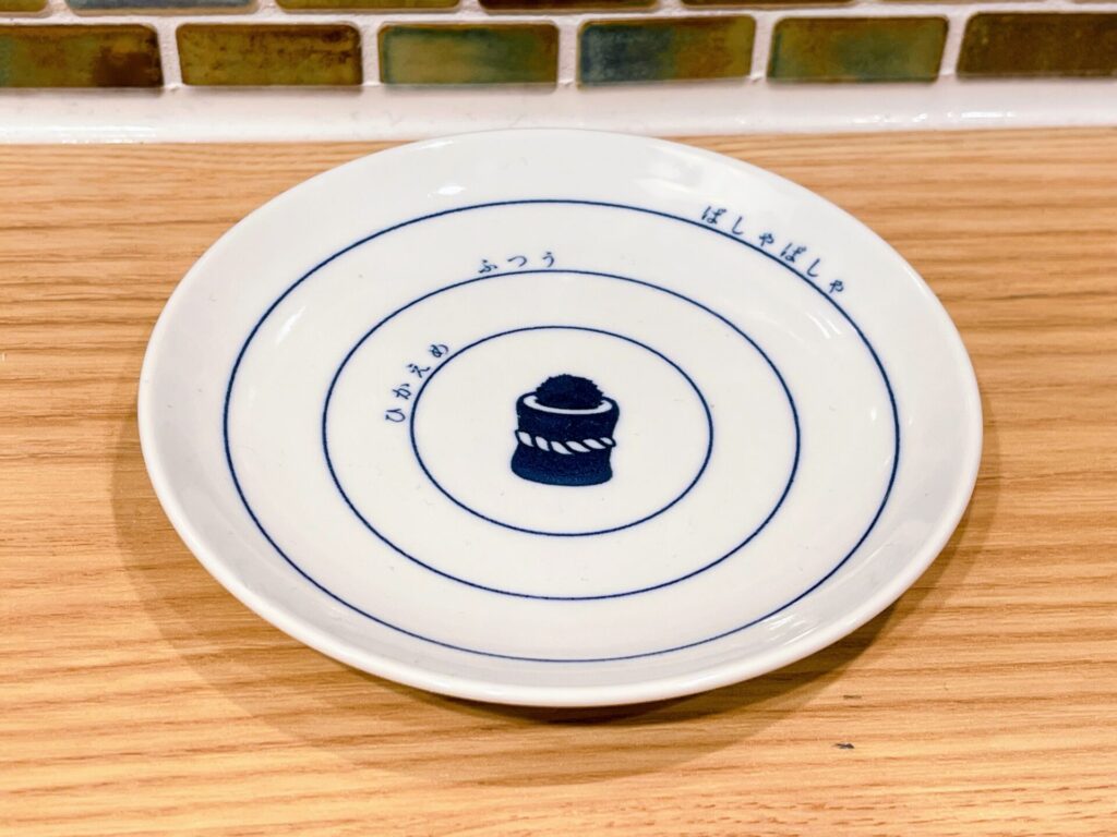 そしてナゴヤトコトンがもう一つ注目したのが「醤油皿」。醤油皿には「ひかえめ」「ふつう」「ばしゃばしゃ」と3重の円が描かれており、醤油の量が一目で分かる形に面白い工夫が凝らされていました。メニューの内容やネーミングだけでなく、こうした細かな部分まで”面白さ”をトコトン追究しているところが、「鮨 酒 肴 杉玉」の楽しさに繋がっているんだと感じます。
