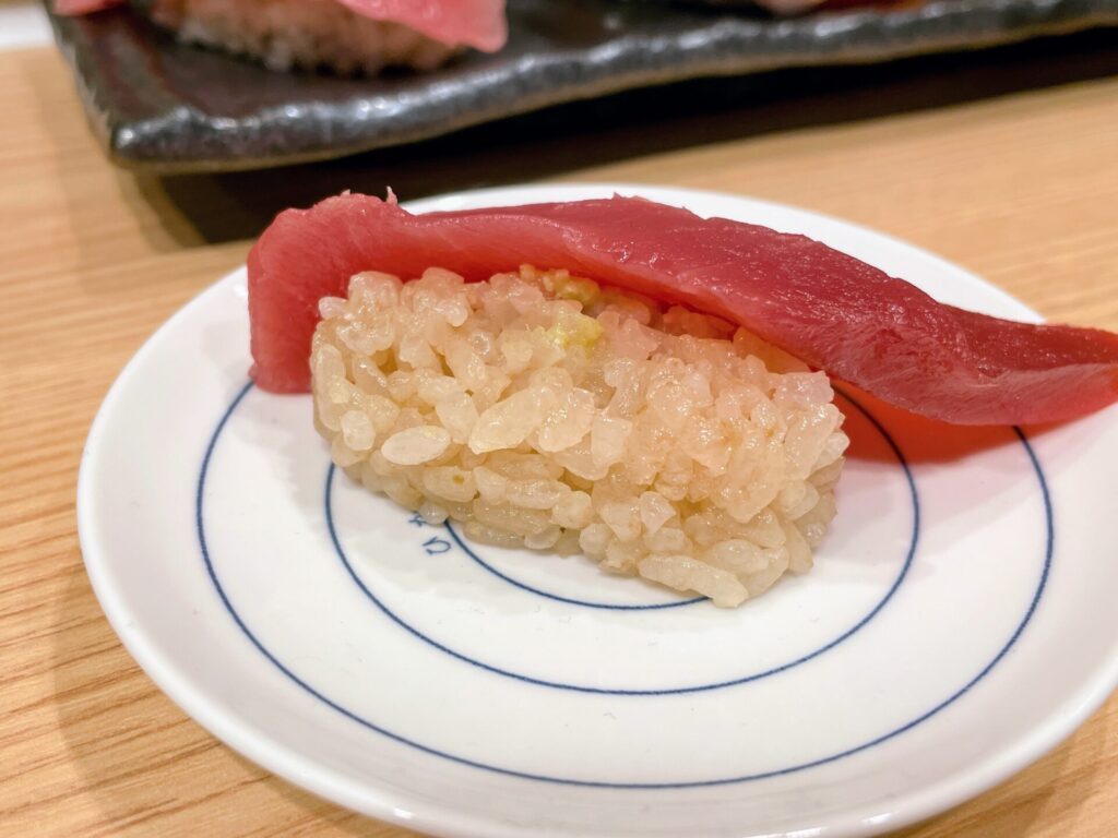 これだけ大きいとネタの味ばかりになってしまうのではないかと感じますが、シャリの味もしっかりと感じられ、”お寿司”としてバランスがしっかり取れているのもポイント。そのヒミツは、「鮨 酒 肴 杉玉」で使われているオリジナルの寿司酢。黒酢とバルサミコ酢をブレンドしたオリジナルの寿司酢を用いたシャリは、旨味とコクがしっかりと感じられる濃い味仕立てとなっており、これだけ大きくて食べ応えのあるネタの味わいもがっちり受け止めています。