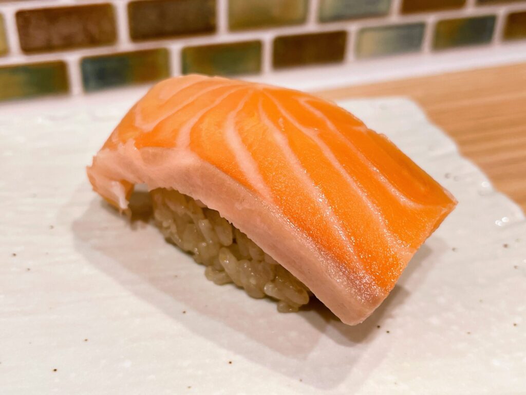 店名を冠した文字通りの”看板寿司”である「飲めるサーモン」は、口の中に入れた瞬間にホロッとほどけてしまうほど柔らかなサーモンにびっくり!!歯を立てるのが間に合わないほど口の中でふんわりと溶けてしまう食感は、もはやサーモンのムースのようです。