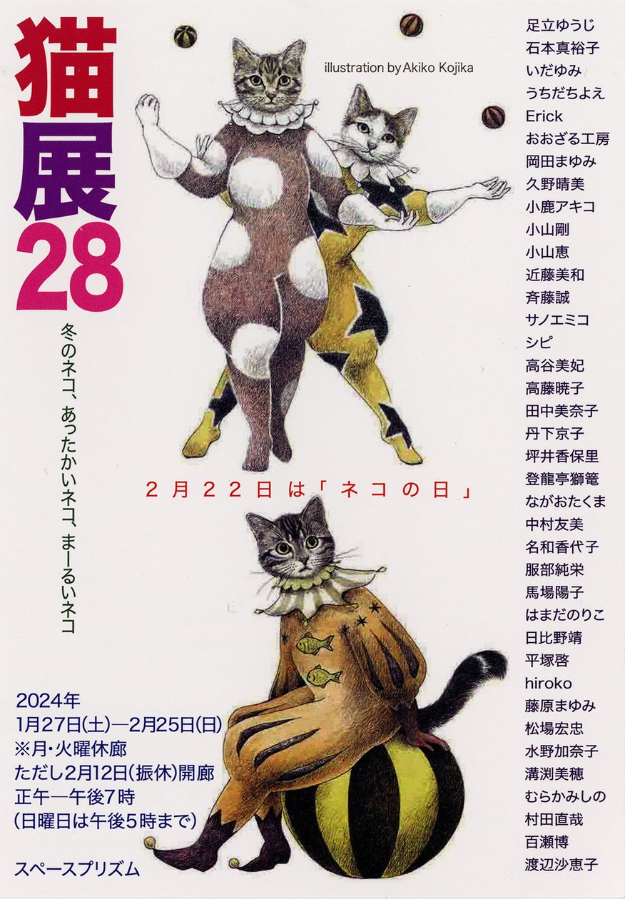今年の「猫展28」のテーマは「冬のネコ、あったかいネコ、まーるいネコ」。名古屋造形大学で学生たちを指導する足立ゆうじ教授、村田直哉教授、はまだのりこ先生、渡辺沙恵子先生、日比野靖さんの作品も出品。さらには名古屋で活躍する“漫画も描ける落語家”登龍亭獅篭師匠も新作とともに参加します。