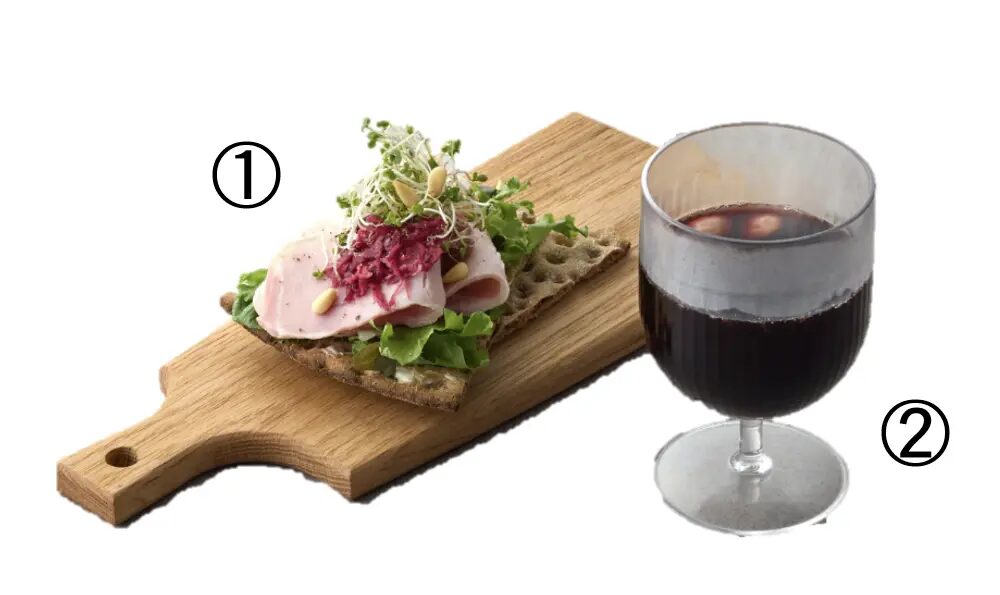 <レクサンド> ①クリスマスクラッカーオードブル 924円 ※各日30食限り ②グロック(北欧風ホットワイン) 720円