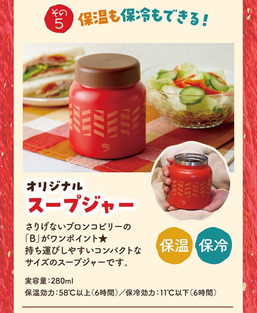 「お買い物保冷バッグ」はレジかごにフィットするサイズで、付属のゴムでコンパクトに折りたたむことが可能。保冷機能もあるのでお買い物の際に大助かりです。「大判ブランケット」「スープジャー」はさりげないブロンコビリーのBがワンポイントで入った素敵なデザイン。こちらも普段使いにピッタリです。