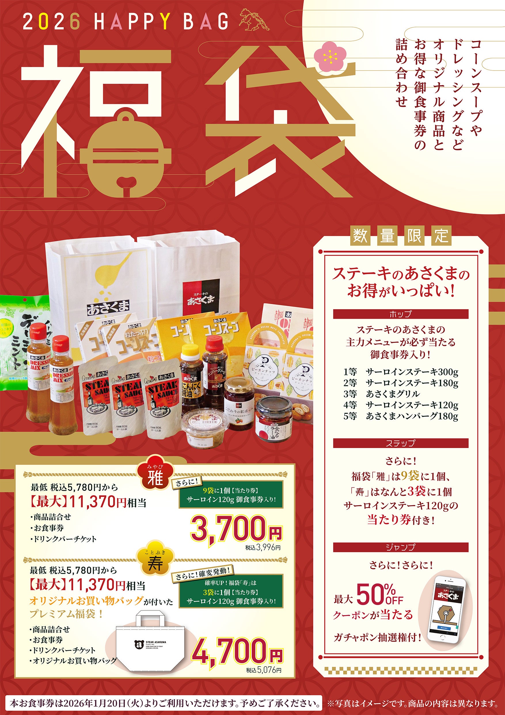 2026年のあさくま福袋は通常版の「雅」に加え、オリジナルお買い物バッグ付きプレミアム福袋の「寿」が登場。あさくまの味を家庭で楽しめる各種商品が入っているほか、主力メニューが必ず当たるお食事券が入っています。さらに運が良ければサーロインステーキ120gの当たり券も追加で入っていることも。「寿」なら3袋に1つが当たり券入り大幅確変が発動です。