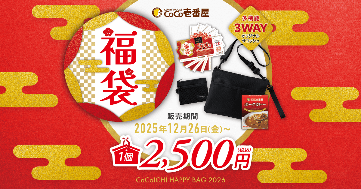 CoCo壱番屋からは、「ココイチ福袋2026」が数量限定で登場。福袋としては珍しい「オリジナルサコッシュ」スタイルで発売されます。
