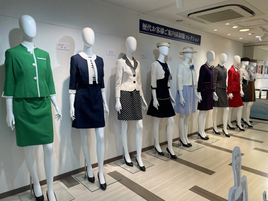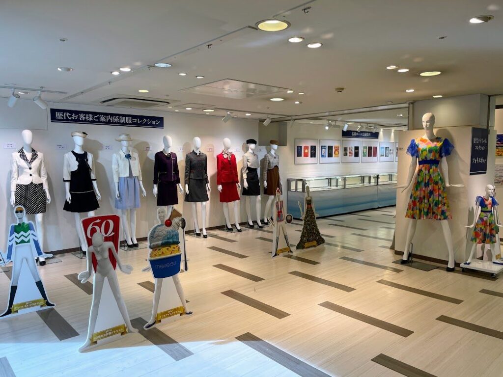 ナナちゃん衣装ギャラリーのすぐ近くには、名鉄百貨店で使われてきた歴代の制服コレクションも展示。最初期は緑色だったのが意外すぎます!