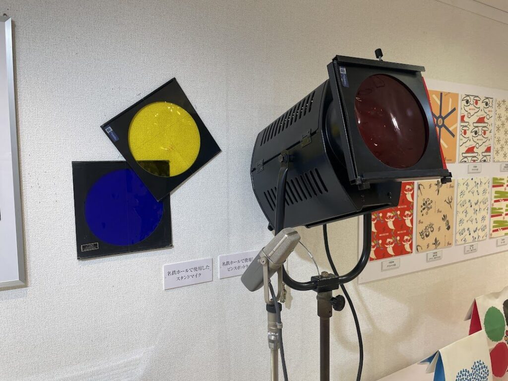 ポスターや台本だけでなく、実際に名鉄ホールで使われていたスタンドマイクやピンスポットライトの「実物」も展示。貴重なお宝に出会うことができます。