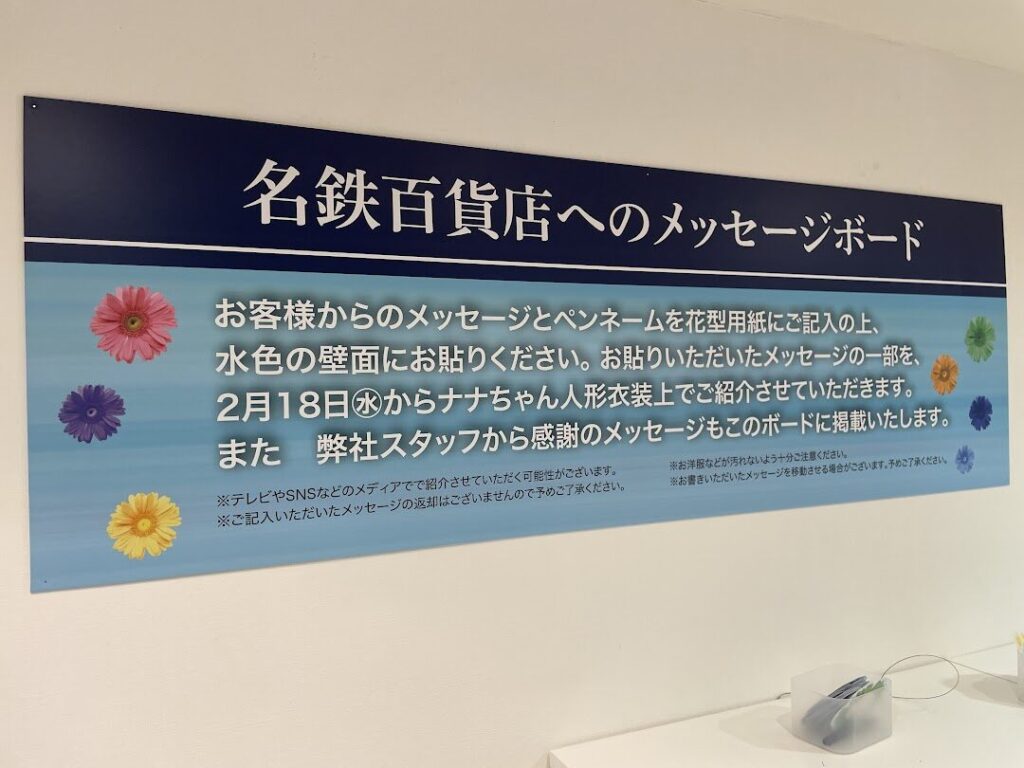 メッセージボードに貼られたメッセージの一部は2月18日からナナちゃん人形の”衣装”上でも紹介されるとのこと。あなたのメッセージが、ナナちゃんとともに名鉄百貨店のフィナーレを飾ります。