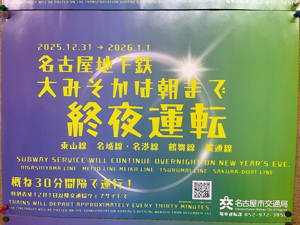 名古屋市営地下鉄【今年も大みそかに終夜運転を実施】