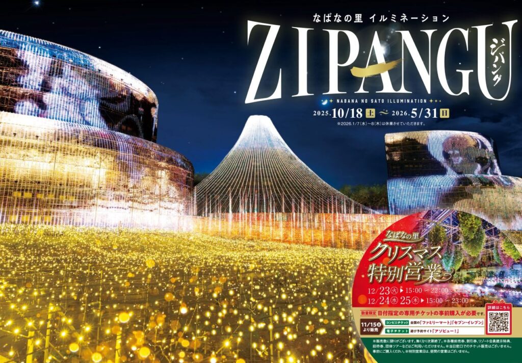 なばなの里は年末から年始にかけて通常どおり営業。元旦1月1日も10時から通常営業となります。「ZIPANG」をテーマに行われる国内最大級のイルミネーションももちろん楽しめます。