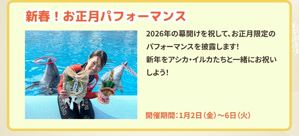 南知多ビーチランド&南知多おもちゃ王国は12月31日まで営業し、1月1日に休園。新年は1月2日より開園し、2026年の幕開けをアシカやイルカたちと一緒にお祝いできる「新春!お正月パフォーマンス」が行われます。