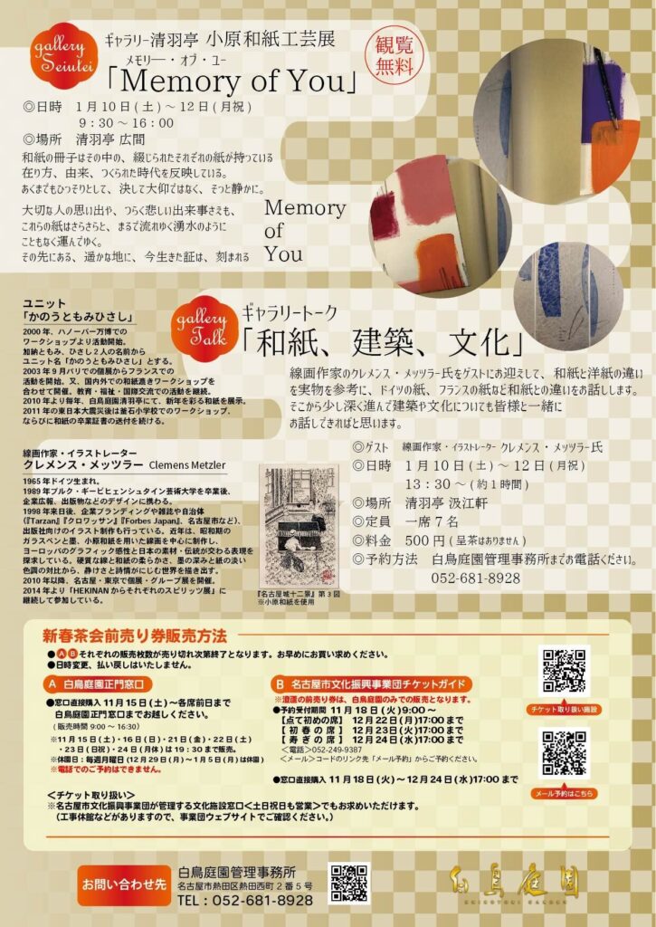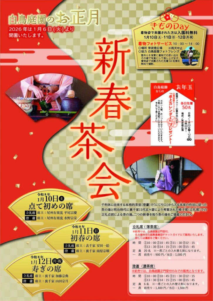 徳川園は12月28日~元旦1月1日まで休園し、1月2日より開園。1月2日は先着300名の方に「徳川園特製カレンダー」と「縁起飴」をプレゼント。1月3日は伝統芸能である尾張万歳「今枝社中」の皆さんが、縁起の良い伝統芸能の祝福芸を披露する「新春万歳」が開催されます。
