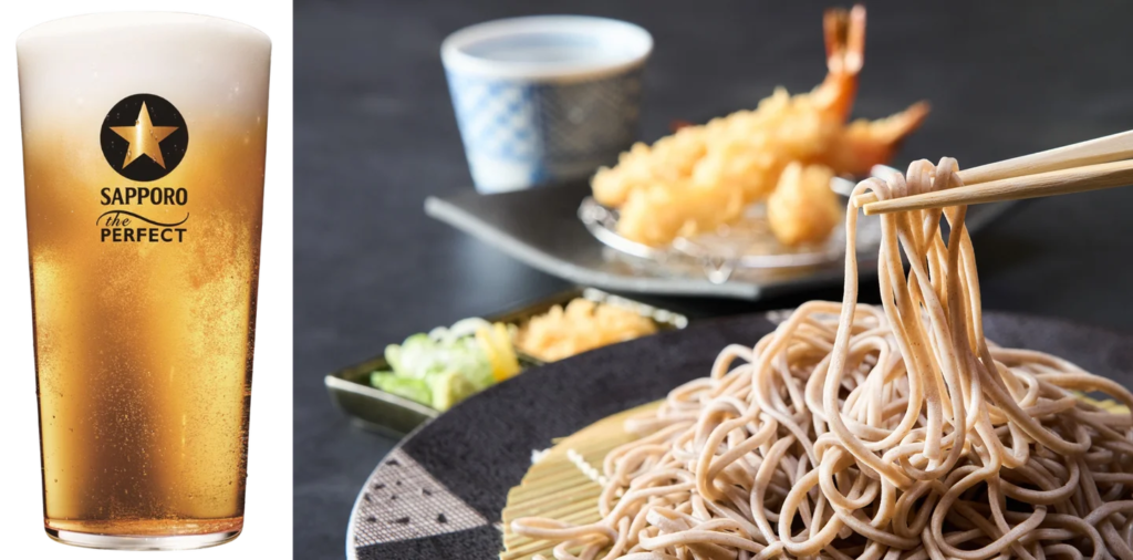 ”そばまえ”というと日本酒のイメージがありますが、サッポロライオン系列の「蕎麦酒 そばえもん」では麦酒(ビール)がおすすめとのこと。泡までおいしい樽生ビール「ザ・パーフェクト黒ラベル」と、現存する日本で最も歴史のある瓶ビール「サッポロラガービール」が、こだわりの蕎麦とそばまえをいっそうおいしく特別なものにしてくれます。